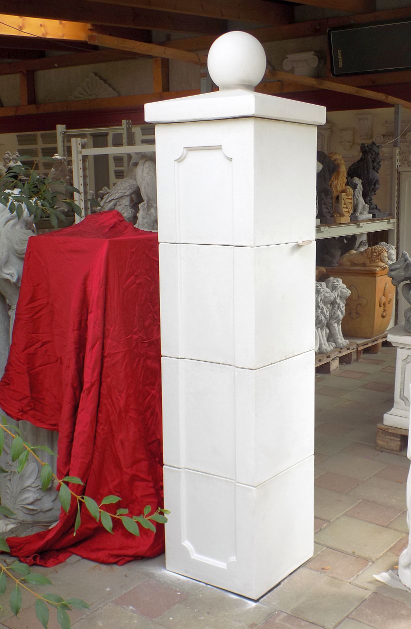 Die modularen Betonpfeiler Segmente lassen sich zu individuellen Gesamthöhen kombinieren. Mit einer Abdeckung und einer dekorativen Kugel entsteht ein klassischer Torabschluss, der perfekt zu schweren Torflügeln, schmiedeeisernen Zäunen oder Steinsockeln passt. Dank der massiven Fertigung aus Weißbeton sind die Elemente frost‑ und witterungsbeständig und halten viele Jahre ohne sichtbare Abnutzung stand.