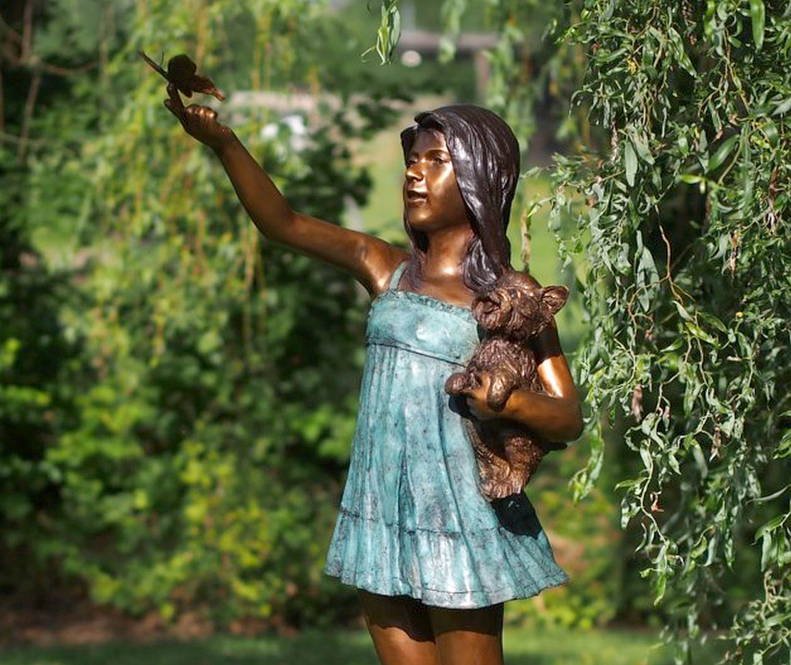 Moderne Bronzeskulptur Mädchen mit Schmetterling und Hund