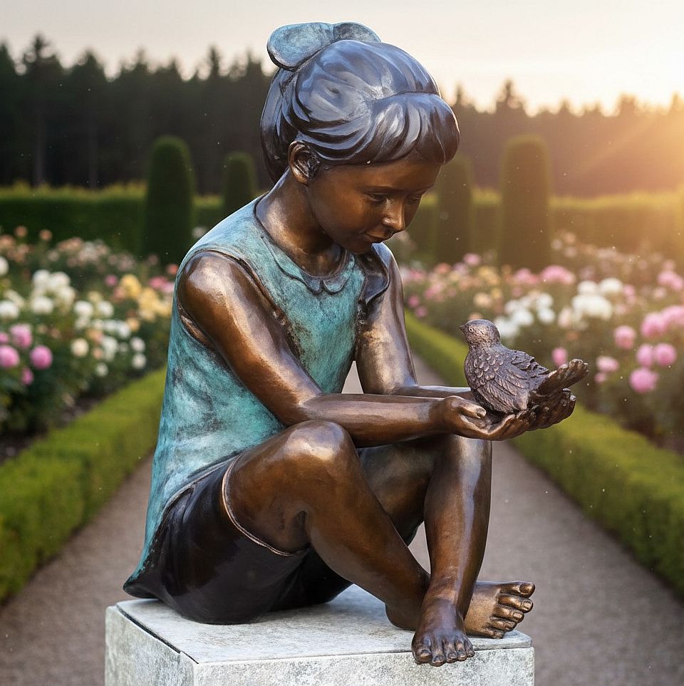 Die Bronze Fgur Mädchen sitzend mit Vogel fasziniert als meisterhafte Bronzeskulptur, die Anmut und Naturverbundenheit verkörpert. Dieses Kunstwerk aus hochwertiger, patinierter Bronze zeigt ein zartes Mädchen in sitzender Pose, das einen kleinen Vogel sanft in den Händen hält. Mit einer Größe von etwa 80-100 cm wird sie zum lebendigen Highlight in jedem Garten oder auf der Terrasse. Die fein ziselierten Details – vom fließenden Haar des Mädchens bis zu den zarten Federn des Vogels – machen diese Bronzefigur zu einem echten Sammlerstück für Liebhaber von Gartenkunst.