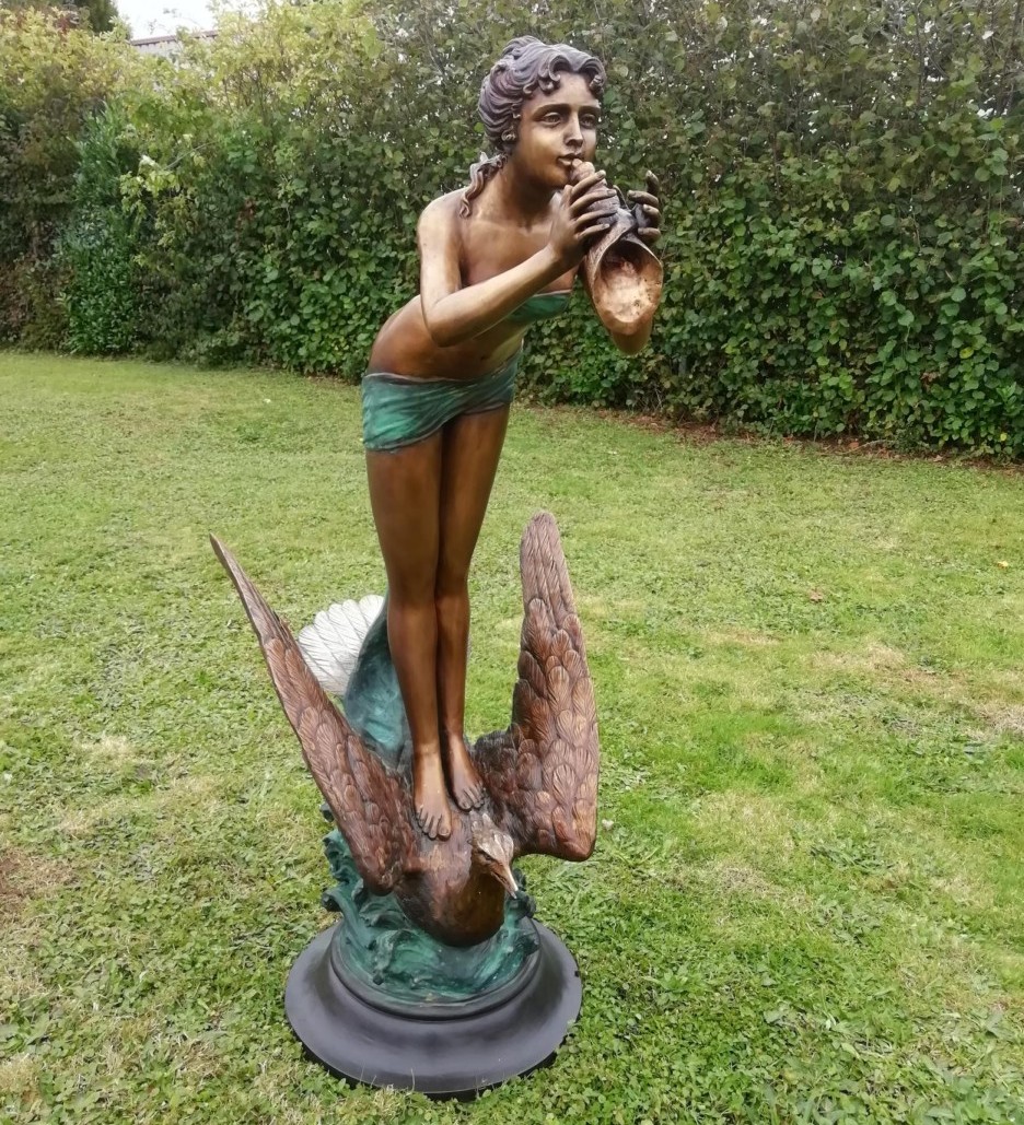 Die Bronzeskulptur Muschelbläserin auf Vogel vereint Kunst, Bewegung und Natursymbolik zu einem faszinierenden Gesamtkunstwerk. Die Szene zeigt eine junge Frau, die auf dem Rücken eines majestätischen Vogels balanciert und in eine Muschel bläst. Dabei dient die Muschel zugleich als Wasserauslauf und verwandelt die Bronzefigur in einen eindrucksvollen Wasserspeier.Diese Skulptur vereint Anmut, Dynamik und feinste Handwerkskunst. Sie scheint die Leichtigkeit des Moments festzuhalten – das Zusammenspiel von Wasser, Wind und Bronze erzeugt eine Atmosphäre von Freiheit und Gelassenheit. Durch ihre erlesene Formensprache und ihre detailgetreue Modellierung fügt sich die Figur harmonisch in Gartenteiche, Brunnenanlagen oder als Solitär in farbenprächtige Blumenbeete ein.
