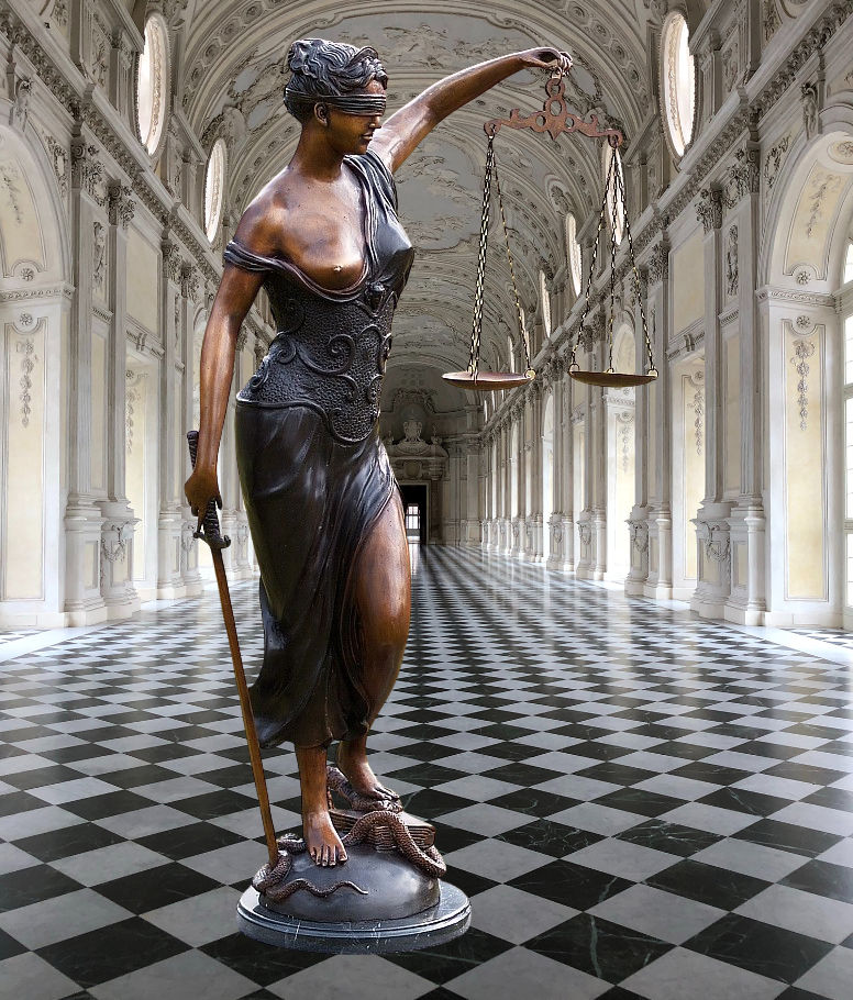 Die Bronzeskulptur Justitia verkörpert die römische Göttin der Gerechtigkeit und steht für Fairness, moralisches Gleichgewicht und Rechtsprechung. Sie ist eine zeitlose Symbolfigur, die seit der Antike das Rechtssystem und seine Werte darstellt. Typisch ist die Darstellung mit Waage, Schwert und Augenbinde, die jeweils für die sorgfältige Abwägung der Fakten, die Durchsetzung von Recht und das Prinzip der Unparteilichkeit stehen.