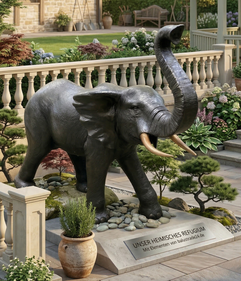 Die Figur wird aus hochwertiger Bronze gefertigt und überzeugt durch ihre kunstvolle Verarbeitung. Als ausdrucksstarke Bronze Gartenskulptur begeistert sie mit fein modellierten Details wie der charakteristischen Hautstruktur, den kräftigen Beinen und dem lebendig gestalteten Rüssel. Die natürliche Patina der Bronze verleiht der Oberfläche eine warme, edle Ausstrahlung. Dadurch passt die Skulptur sowohl in klassische Gärten als auch in moderne Park Außenanlagen. Gleichzeitig sorgt das robuste Material dafür, dass die Figur über viele Jahre hinweg ihre Schönheit behält.
