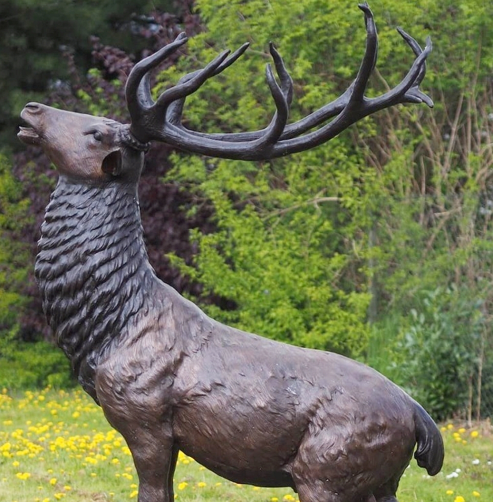 Die einzigartige Bronze-Patina in verschiedenen Brauntönen verleiht der Skulptur eine warme, lebendige Wirkung und unterstreicht die Lebendigkeit des Motivs. Der Hirsch steht auf einem naturgetreu nachgebildeten Fels-Sockel, der nicht nur für Stabilität sorgt, sondern auch den wilden Charakter der Szene betont. Diese Zwölfender Geweih Hirsch Bronzeskulptur begeistert Menschen jeden Alters und ist ein Highlight in jedem Garten, Eingangsbereich oder Jagdzimmer.Sie verbindet höchste handwerkliche Qualität mit künstlerischer Ausdruckskraft. Gegossen im traditionellen Wachsausschmelzverfahren und sorgfältig patiniert, ist diese Gartenfigur besonders wetterbeständig und langlebig – perfekt für den ganzjährigen Außeneinsatz. Die mächtige Präsenz des röhrenden Hirsches macht diese Bronzeskulptur zu einem majestätischen Symbol für Stil, Naturverbundenheit und Eleganz. Ob als repräsentative Außendekoration, exklusives Sammlerstück oder besonderes Geschenk für Jäger und Naturfreunde – die „Röhrender Hirsch auf Fels“ Skulptur setzt eindrucksvoll Akzente und schafft ein stilvolles Ambiente.