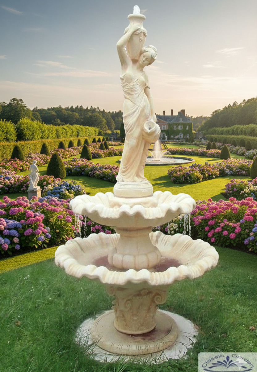 Dieser großzügig gestaltete Gartenbrunnen ist ein eindrucksvolles Gestaltungselement für weitläufige Gärten, Höfe oder repräsentative Außenanlagen. Mit seiner klassischen Formensprache und der zentral platzierten Figur der Wasserträgerin erinnert der Brunnen an historische Park- und Schlossgärten. Aus den beiden Krügen der Figur fließt das Wasser sanft in die obere Schale und anschließend kaskadenartig weiter in die große untere Brunnenschale. Als Gartenbrunnen wird er so zu einem lebendigen Mittelpunkt im Garten.
