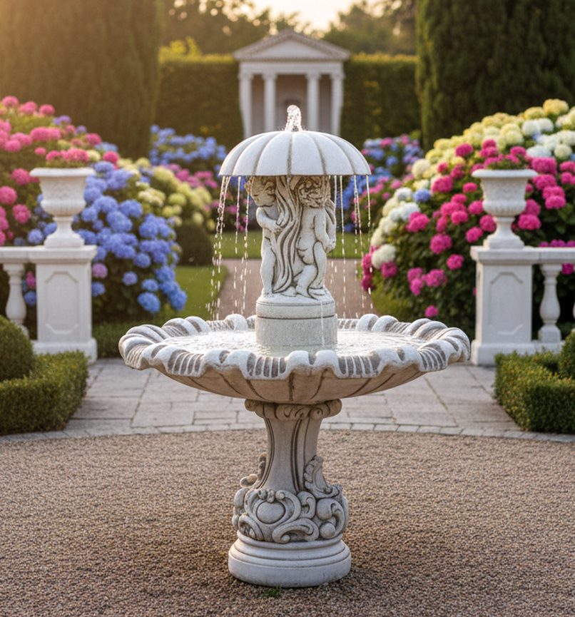 Figur und Schirm werden als hochwertige Einzelteile geliefert, die sich mühelos zu einer harmonischen Einheit zusammenfügen lassen. Der Wasseraustritt erfolgt zentral im Schirm, sodass das Wasser gleichmäßig über den Rand in die großzügige Brunnenschale rinnt. Diese Konstruktion schafft ein beruhigendes Wasserspiel mit maximaler dekorativer Wirkung.