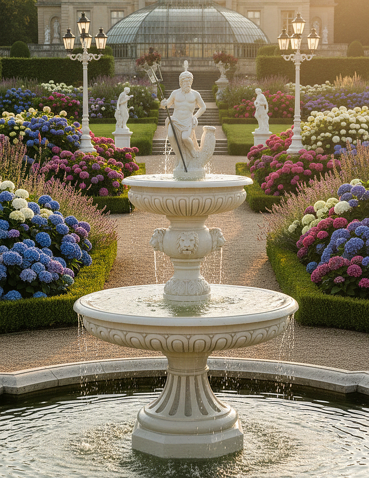 Maße des Großen Neptun Gartenbrunnens: Höhe 308 cm, Gewicht 907 kg – tiefe Wasserschalen mit reichlich Wasserinhalt. Brunnen aus massivem Weißbeton mit detaillierter Struktur. Wasserpumpen nicht inklusive. Die imposante Poseidon-Figur dominiert die Anlage mit klassischer Gottheitengestalt. Vier Löwenköpfe verzieren die zentrale Brunnensäule harmonisch.