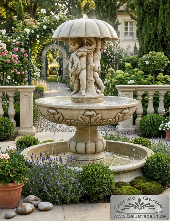 Die kunstvolle Putten Kinderfigur unter dem Schirm ist sorgfältig ausgearbeitet und verleiht dem Brunnen eine charmante, lebendige Ausstrahlung. Der massive Standfuß sorgt für zusätzliche Stabilität und eine harmonische Gesamtproportion. Für den Betrieb wird eine geeignete Wasserpumpe benötigt, die nicht im Lieferumfang enthalten ist. Der Aufbau sollte auf einem tragfähigen, ebenen Untergrund erfolgen.