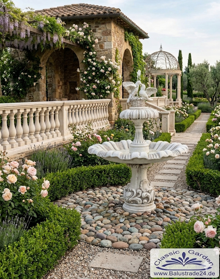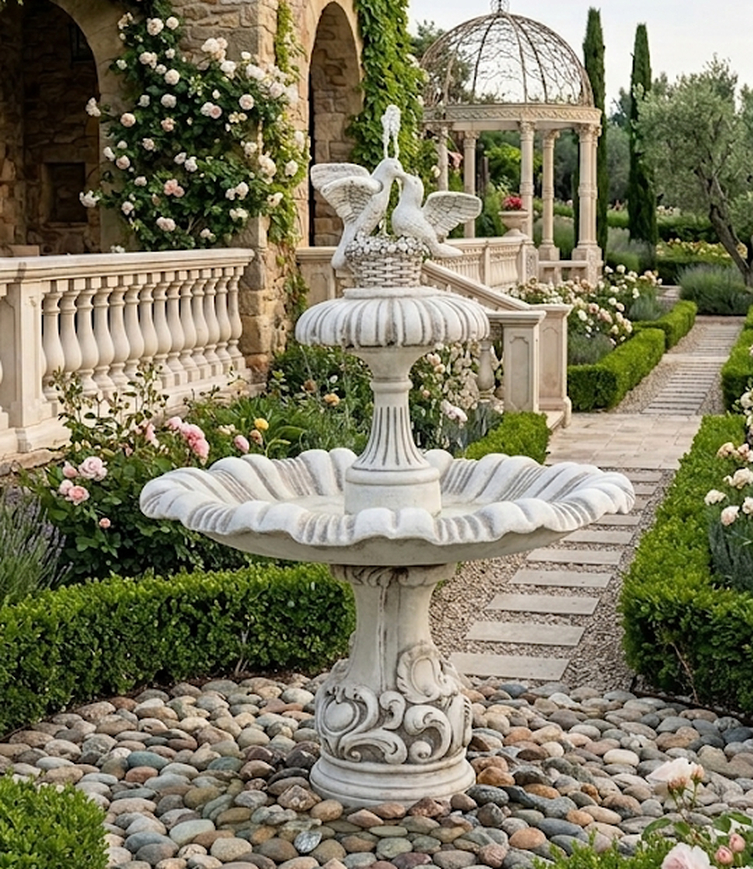 Dieser kunstvoll gestaltete Gartenbrunnen mit zwei liebevoll ausgearbeiteten Turteltauben ist ein stilvoller Blickfang für jeden Außenbereich. Als eleganter Taubenbrunnen verbindet er romantisches Design mit klassischer Formgebung und eignet sich ideal als zentrales Gestaltungselement im Garten oder auf großzügigen Terrassenflächen. Durch seine imposante Höhe von 166 cm entsteht eine beeindruckende Präsenz, die Beete, Rasenflächen oder Innenhöfe optisch aufwertet. Besonders in traditionell angelegten Gärten entfaltet dieser Zierbrunnen seine volle Wirkung.