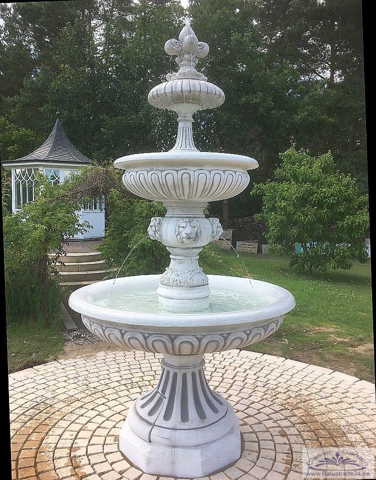 - Wasserlauf des Brunnens erfolgt ganz oben auf der Spitze des Brunnens und über die 4 Löwenköpfe der Brunnenmittelsäule. Die Wasserpumpe liegt versteckt in der unteren, großen Brunnenschale und wird von dieser nach oben zur Brunnenspitze gefördert. Der Brunnen hat somit ein umlaufenden Wasserkreislauf und benötigt keinen direkten Wasseranschluß.