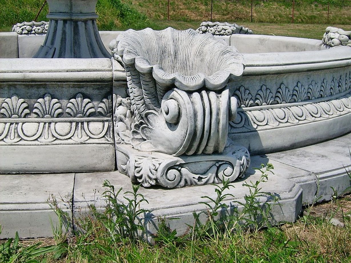 Die Brunnenteile müssen auf einer betonierten, tragfähigen und frostsicheren Betonfläche (Betonfläche nicht Gegenstand dieses Angebotes!) aufgestellt werden, wo bereits auch die wasserführenden Rohrleitungen für die Brunnenfigur sowie auch für die seitlichen, wasserspeienden Muschelelemente mit eingegossen werden sollten! Farbe des gesamten Brunnens in weiß, Oberfläche leicht hellgrau patiniert, um die Oberflächen Strukturen besser optisch hervorzuheben.