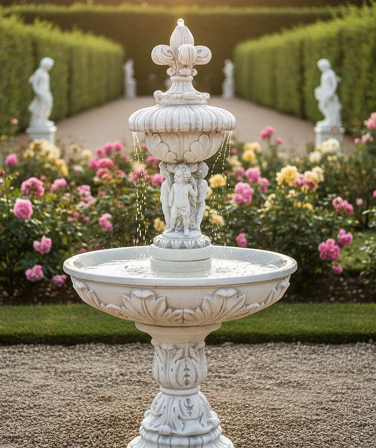 Sonderzusammenstellung aus mehreren Einzelteilen einer Komposition von Brunnenschale, einer Engelvase und Kreuzblumen Spitze. Sehr schöner Wasserablauf über den Wasserpilz, der wie ein Wasservorhang vor den Engelfiguren herunter fällt. Schöner Gartenbrunnen mit reich verzierter Brunnenschalen, mit Blattmotiven des Akanthusblattes. Dekorativer Brunnenfuß dient als stabiler Standfuß des Garten Springbrunnen.- Der Brunnen findet auch optimalerweise seinen Platz in der Mitte eines großen Brunnenbeckens als Kaskadenbrunnen.