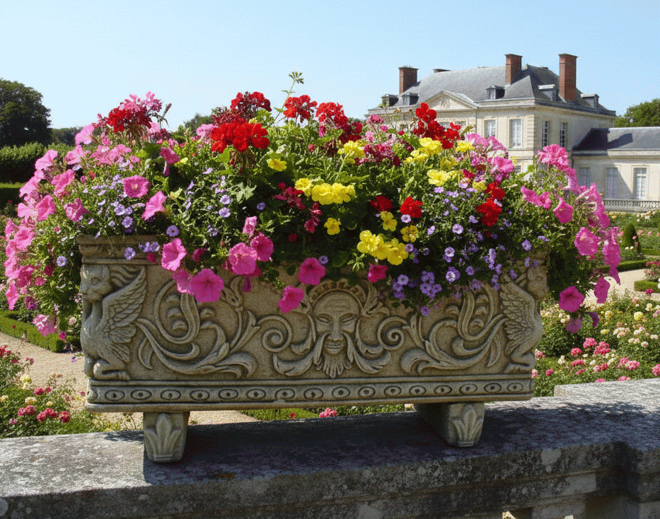 Pflanzkasten mit reicher Verzierung mit Fabelwesen und Drachen