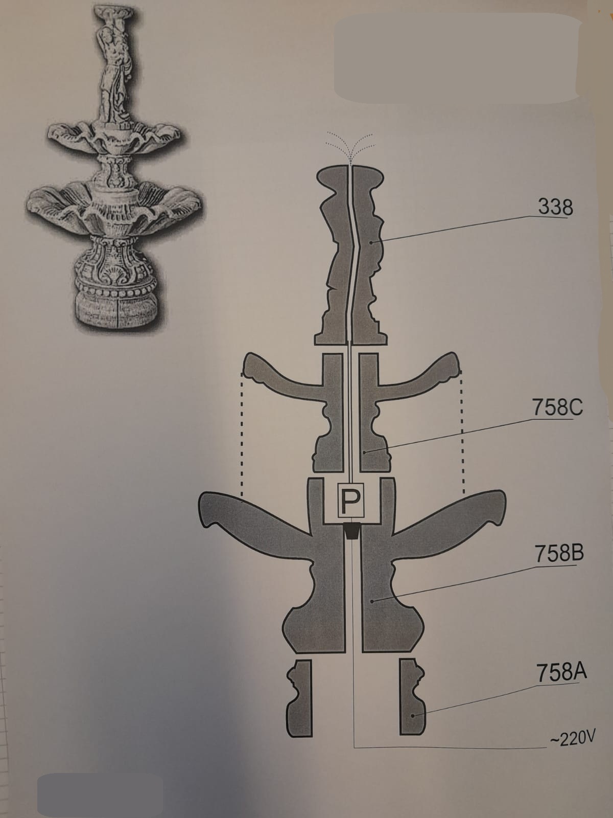 Brunnen ist aus massivem Weißbeton gegossen, im Steinguss Verfahren, mit Formen hergestellt.