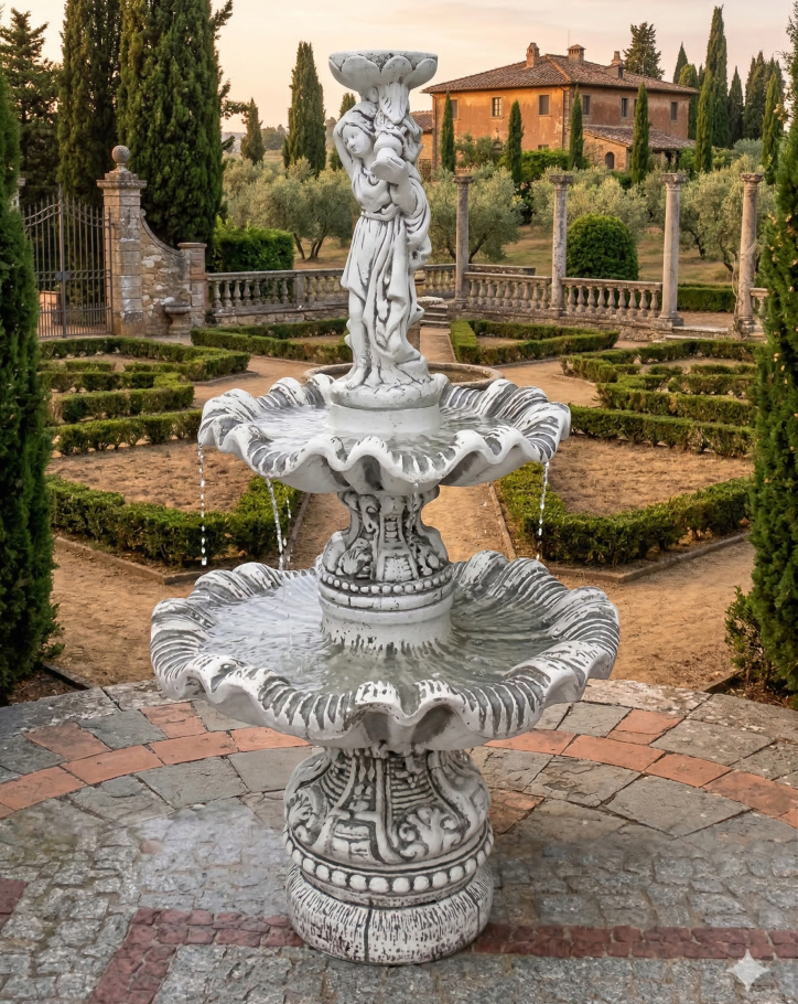 Gartenbrunnen mit 2 Wasserschalen und Gartenfigur