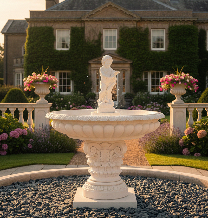 Gartenbrunnen mit Figur – repräsentativer Standbrunnen aus Weißbeton