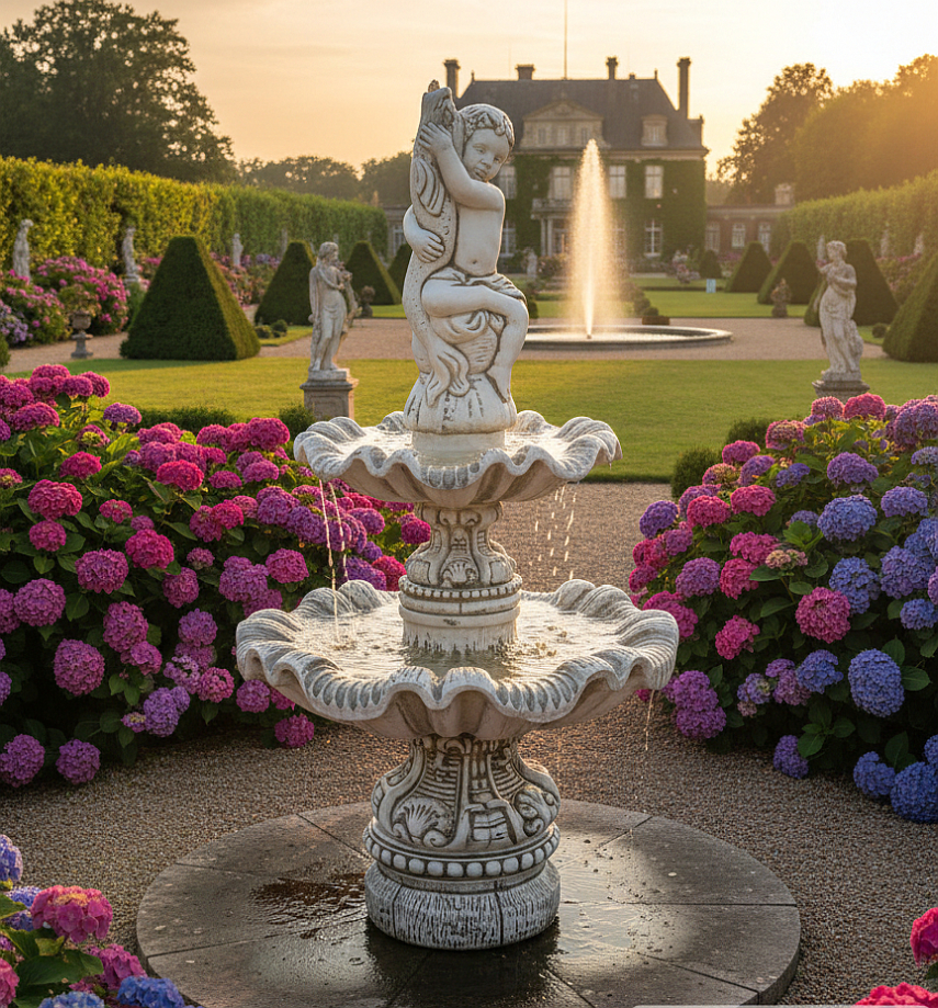 Dieser reich verzierte Gartenbrunnen mit Puttenfigur und Fisch ist ein klassisches Schmuckstück für anspruchsvolle Gartengestaltungen. Die harmonische Kombination aus zwei Wasserschalen, einer dekorativen Mittelsäule und der detailreich ausgearbeiteten Steinfigur verleiht dem Brunnen eine zeitlose Eleganz. Als hochwertiger Gartenbrunnen eignet er sich ideal für zentrale Gartenbereiche, Innenhöfe oder repräsentative Plätze. Die Putte mit Fisch fungiert dabei als dekorativer Wasserauslass und bildet den optischen Mittelpunkt des Brunnens.