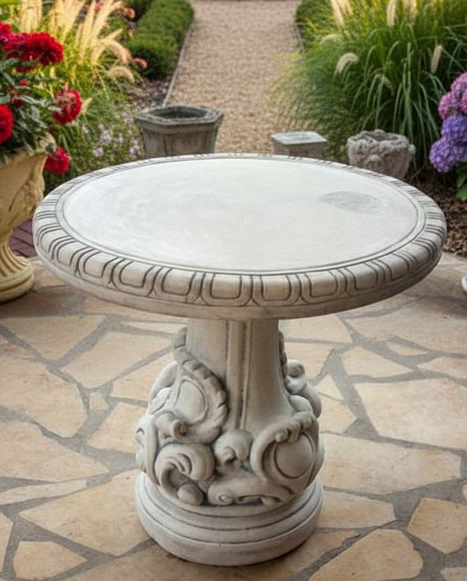 Dieser hochwertige Gartentisch aus weißem Beton eignet sich ideal als Teil einer Sitzgruppe für Garten, Balkon oder Terrasse. Der Tisch besticht durch seine massive Ausführung und den dekorativen Tischfuß mit verzierter Tischkante, der jedem Außenbereich einen stilvollen Akzent verleiht.