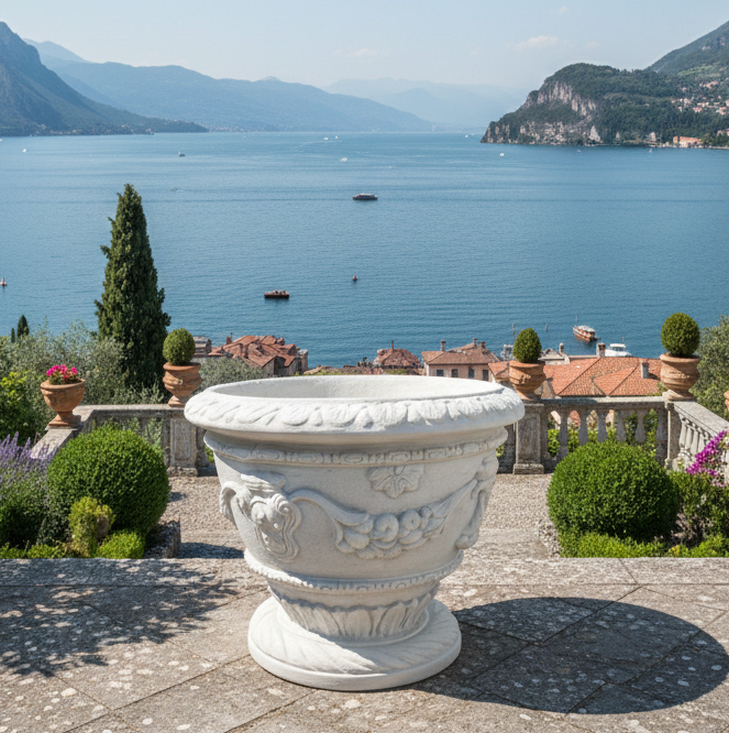 ✅Prunkvoller Pflanzkübel aus weißem Steinguss mit Blumenranken & Wappen