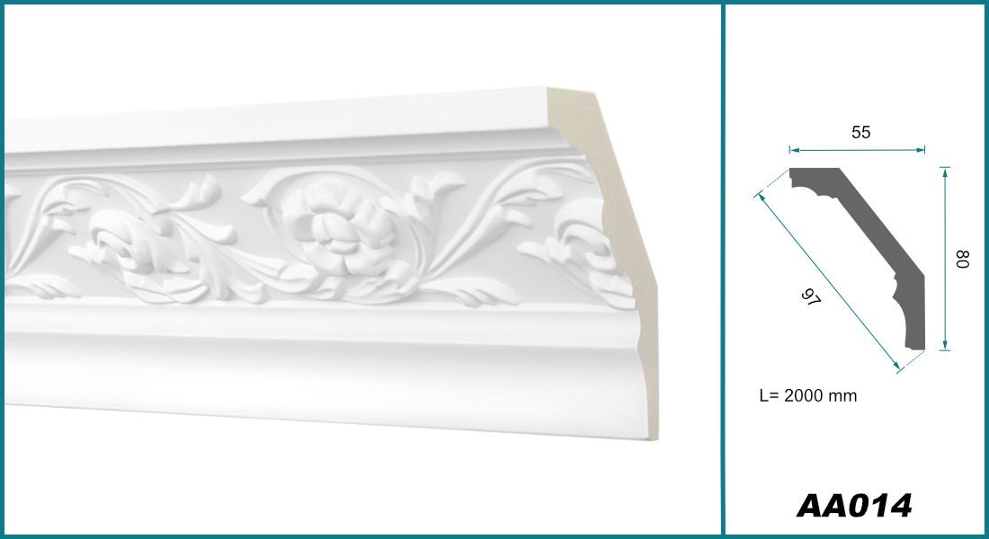 Die Stuck Eckprofil Leiste AA014 wird aus hochwertigem Polyurethan (PU-Hartschaum, Dichte ca. 220 kg/m³) gefertigt und eignet sich ideal als dekorative Decken-Eckleiste. Mit den Abmessungen 80 x 55 mm, einer Diagonalen von ca. 97 mm und einer Länge von 2000 mm verleiht sie Räumen ein elegantes und stilvolles Erscheinungsbild.