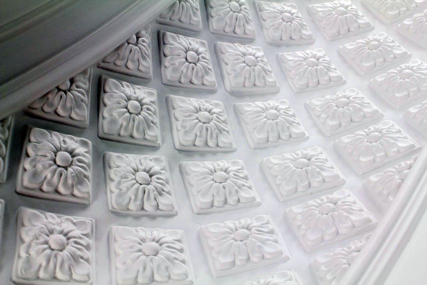 Die Deckenkuppel wird als Kuppel-Set geliefert und besteht aus insgesamt 24 einzelnen Dekorelementen, die vor Ort zur vollständigen Kuppel montiert werden. Das Set wird ohne Deckenrosette R120 sowie ohne abgebildeten Kronleuchter ausgeliefert. Passende Deckenrosetten können separat aus unserem Sortiment frei ausgewählt und ergänzt werden.