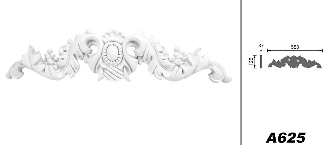 Mit Abmessungen von ca. 125 × 550 mm und einer Tiefe von etwa 37 mm bietet das Zierelement eine ausgewogene plastische Wirkung. Es kann sowohl im Innenbereich als dekoratives Stuckelement verwendet werden als auch zur Bekrönung von Fenstern und Türen dienen. Darüber hinaus eignet es sich hervorragend für die Gestaltung von Hausfassaden als stilvolles Fassadenstuck-Dekorelement.