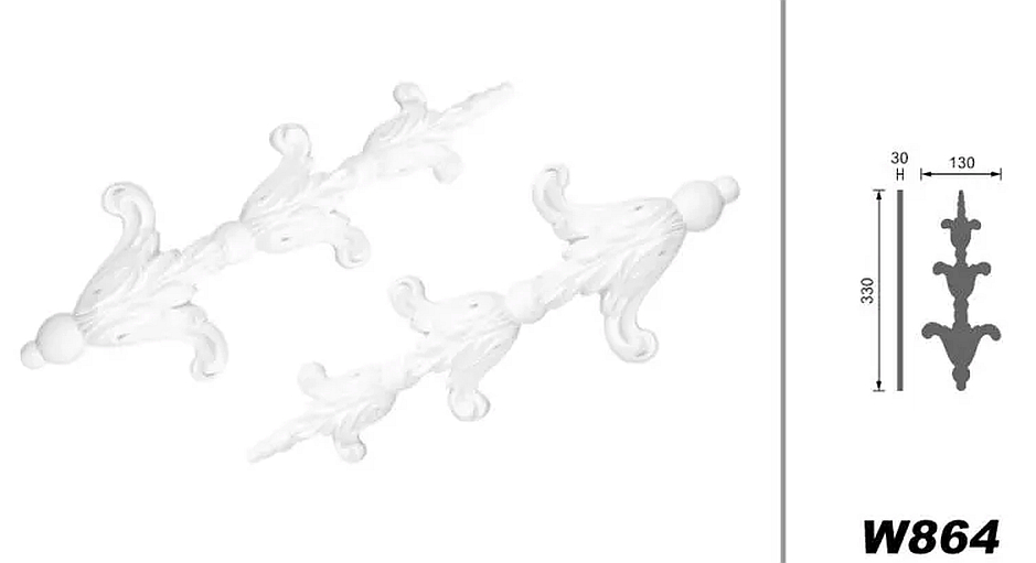Mit Abmessungen von ca. 330 × 130 mm und einer Höhe von etwa 30 mm bieten die Zierelemente eine ausgewogene Größe für vielseitige Gestaltungsmöglichkeiten. Sie lassen sich einzeln oder paarweise einsetzen, beispielsweise zur Betonung von Wandfeldern, Fensterachsen, Fassadenstrukturen oder als dekoratives Element in Kombination mit Stuckleisten.