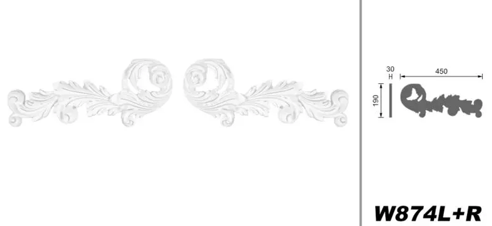 Die Innenstuck Zierelemente W874L+R sind dekorative Stuckornamente aus hochwertigem Polyurethan-Hartschaum und wurden als aufeinander abgestimmtes Links- und Rechts-Element konzipiert. Sie eignen sich ideal zur symmetrischen Gestaltung von Wand- und Deckenflächen und setzen elegante Akzente in klassischen wie auch stilvoll modernen Innenräumen. Auch als Fassadenstuck Dekor Elemente im Außenbereich verwendbar.