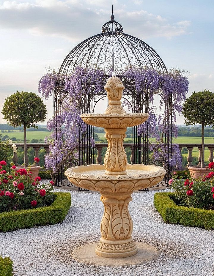 Gefertigt wird der Springbrunnen aus massivem Kunstbeton auf Weißzement‑Basis im hochwertigen Steingussverfahren. Dieses Material verbindet Stabilität, Beständigkeit und edle Optik. Die Oberfläche ist farbig patiniert und zeigt aufwendige Strukturen, die Licht und Schatten lebendig betonen. Durch die sorgfältige Verarbeitung entsteht ein langlebiger Brunnen, der den Charme klassischer Gartenarchitektur mit moderner Qualität vereint.