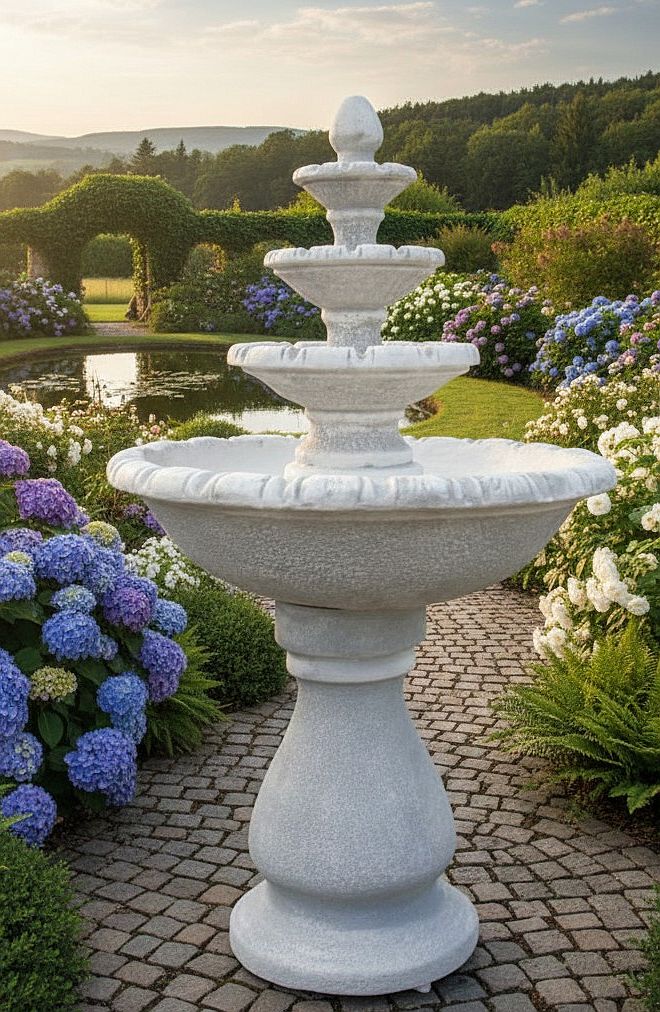 Dieser toskanische Kaskadenbrunnen ist die ideale Wahl für Liebhaber klassischer Gartengestaltung. Ob in Innenhöfen, auf Terrassen, in Parkanlagen oder als solitärer Blickfang inmitten von Rosenbeeten – er schafft mit seinem Wasserrauschen und der mediterranen Eleganz unvergleichliche Atmosphäre. Unser Sortiment bietet zudem zahlreiche weitere Gartenbrunnen und Figuren für harmonische Gesamtkonzeptionen.
