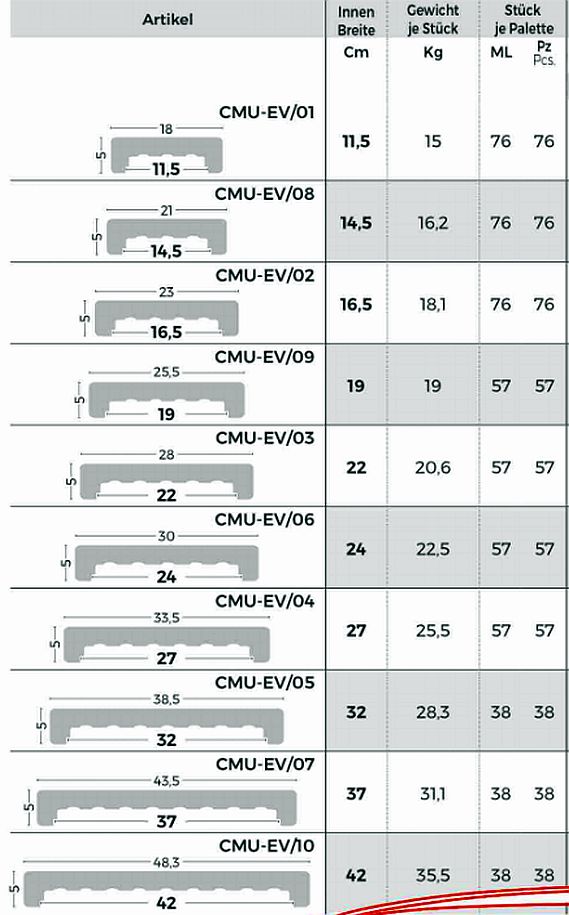 - Lieferbare Betonplatten Breiten / Mauerwerk Breite / Gewicht je Platte: