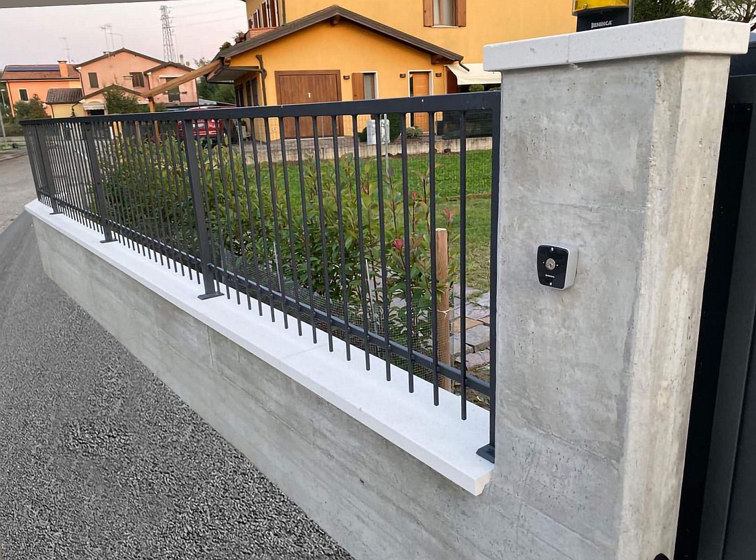 - Bei der Installation eines Zauns auf dem Mauerabschluss ist darauf zu achten, dass ein Bewegungsabstand zwischen der installierten Struktur und dem Umfang des Lochs eingehalten wird. Füllen Sie das Loch mit einem speziellen, elastischen Dichtstoff für den Außenbereich, um ein Reißen des Mauerabschlusses bei eventueller Ausdehnung oder Bewegung des Zauns im Laufe der Zeit zu verhindern.