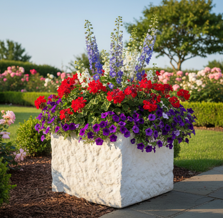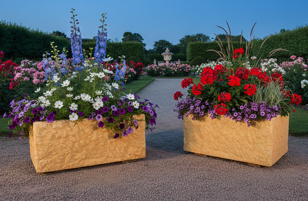Die verwitterte Sandsteinoptik wirkt wie handbehauener Naturstein. Perfekt für Kräuter, Blumen oder als rustikales Wasserbecken. Die quadratisch-rechteckige Form harmoniert mit Landhausgärten, Bauerngärten oder mediterranen Terrassen.