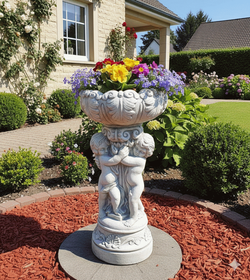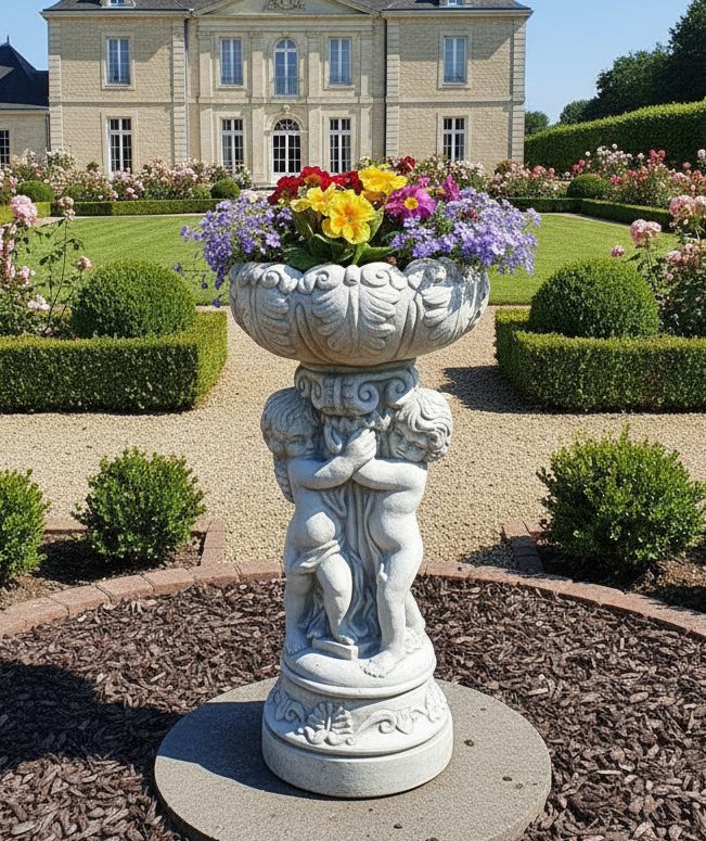 Drei detailgetreue Puttenfiguren tragen die 32cm Blumenschale mit floralen Ornamenten. Perfekt für Eingangsbereiche, Terrassen oder als solitärer Blickfang. Die Barockoptik harmoniert mit Rosen, Lavendel oder Ziergräsern in anspruchsvoller Gartengestaltung.