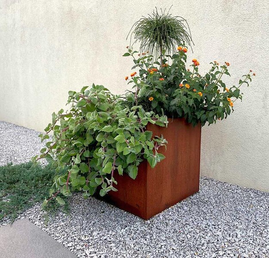 Corten Metallblumentopf – Würfel förmig | eleganter, wartungsarmer Pflanzkübel aus 2 mm Cortenstahl mit Drainagelöchern und charakteristischer Rostpatina.
