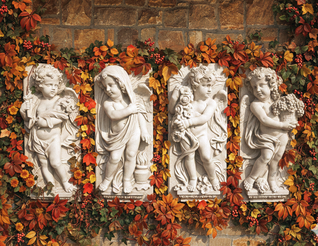 Als saisonales Fassadenstuck Relief harmonieren die Engelplatten mit Pilastern, Gesimsen und Rundbögen. Besonders eindrucksvoll als Vierergruppe über Portalen oder als Solitär an Gartenmauern. Die Patina betont die zeitlose Symbolik der Jahreszeiten.