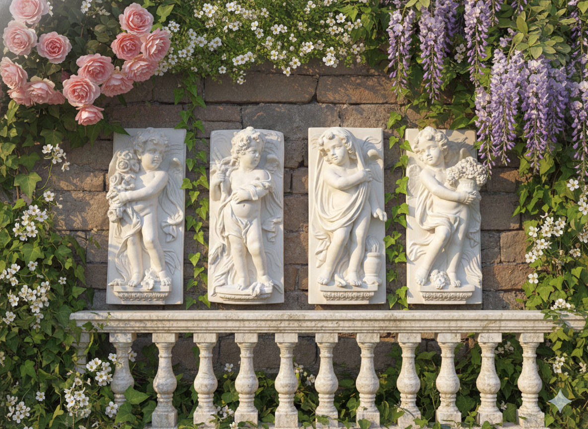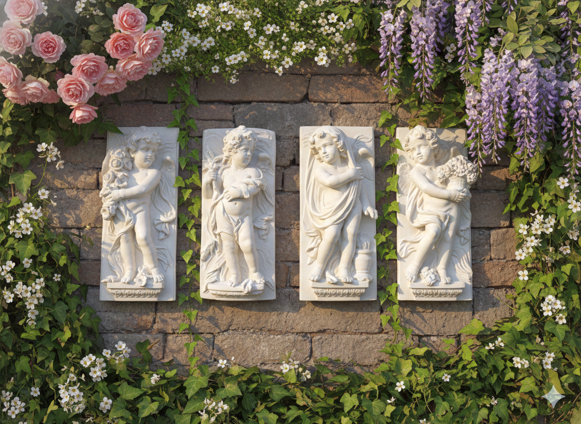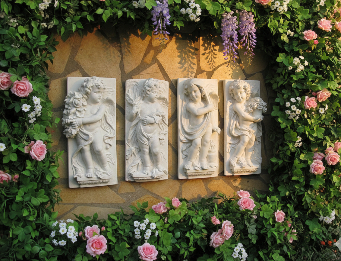 Diese sakrale Jahreszeiten Wandbilder repräsentieren höchste Reliefkunstfertigkeit. Die Weißbeton Engelplatten schaffen symbolische Gartenhöhepunkte mit christlicher Ikonographie. Für Kirchgärten, Klostermauern und Villenarchitektur – bleibende Werte aus massivem Kunststein.