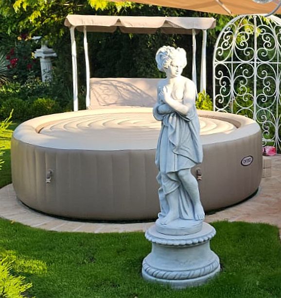 Die kunstvolle Paolina Steinfigur von Canova zeigt die elegante Frau mit Badetuch als lebensnahe Gartenskulptur. Diese exklusive Paolina media aus weißem Kunststeinbeton eignet sich ideal für Poolbereiche, Spas und hochwertige Gartendekoration. Nur noch 1 Stück lagernd!